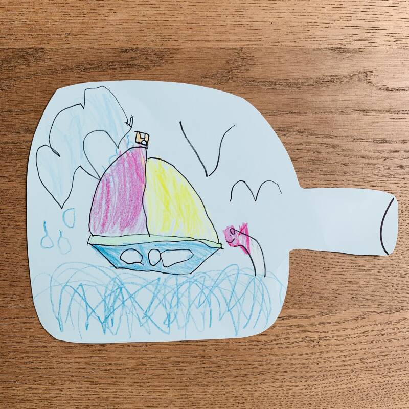 Laat de kinderen met kleurpotloden, krijtjes of stiften een boot in de fles tekenen. Teken ook de zee en de lucht erbij.