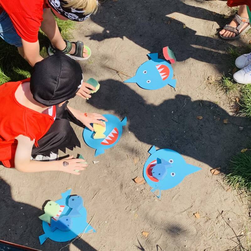Benodigdheden: Visjes geknipt van schuursponsjes, haaienbekken gemaakt van kartonnen bordjes.