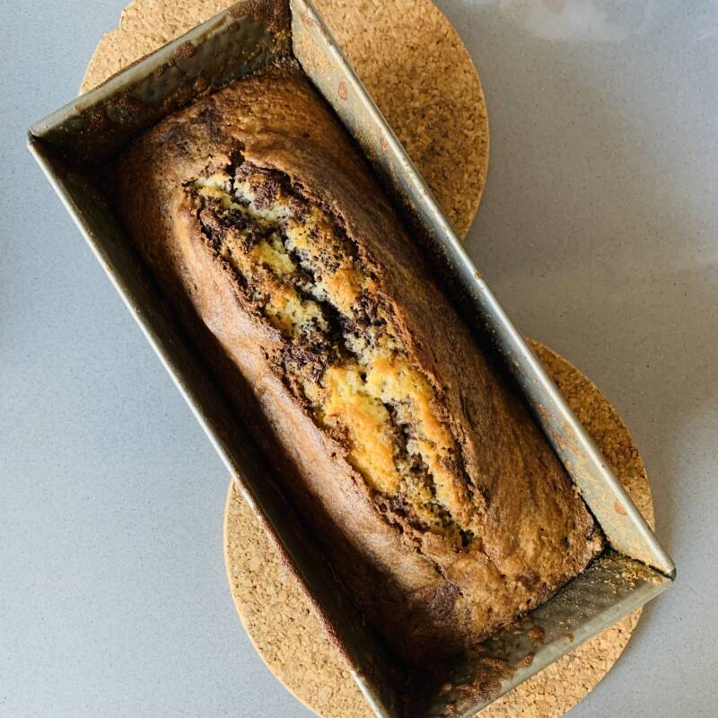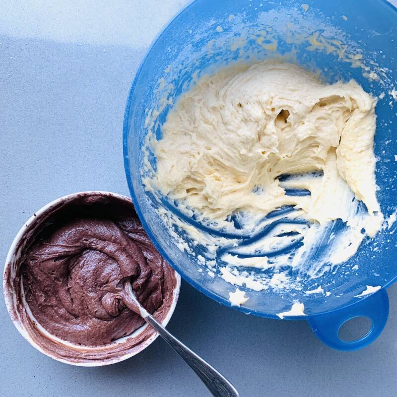 Als je een marmercake met chocolade ervan wil maken doe dan één derde van het cake beslag in een andere kom. Doe hier twee eetlepels cacaopoeder bij en roer het goed door elkaar heen.