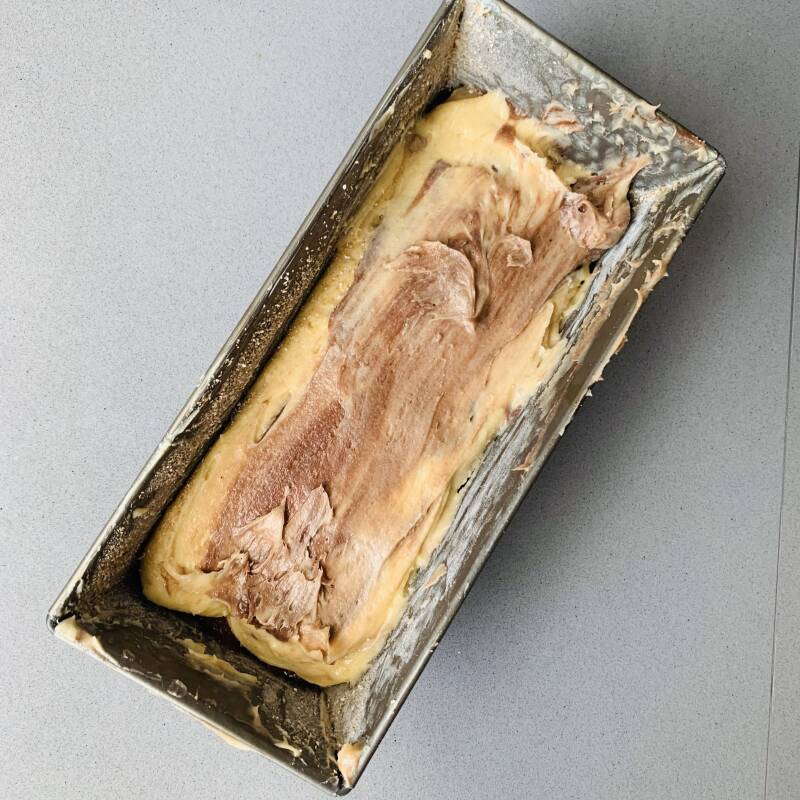 En verdeel daarna de ander helft van het witte vanillemengsel over de bakvorm. Maak met een mes een ronddraaiende beweging door het beslag. Doe dit een paar keer, maar niet te vaak anders lopen de kleuren teveel door elkaar heen.