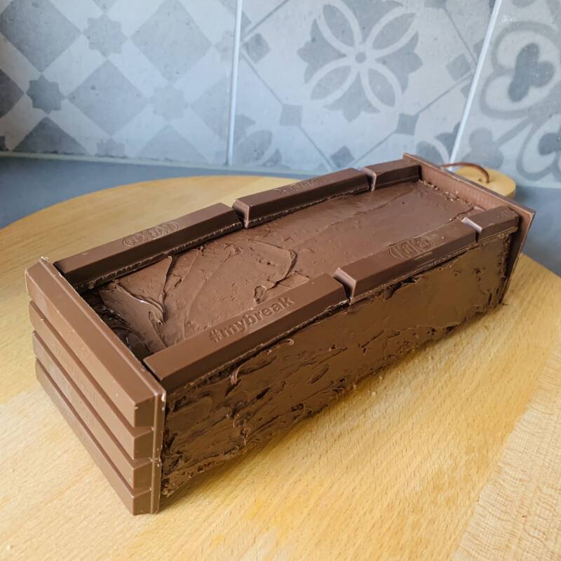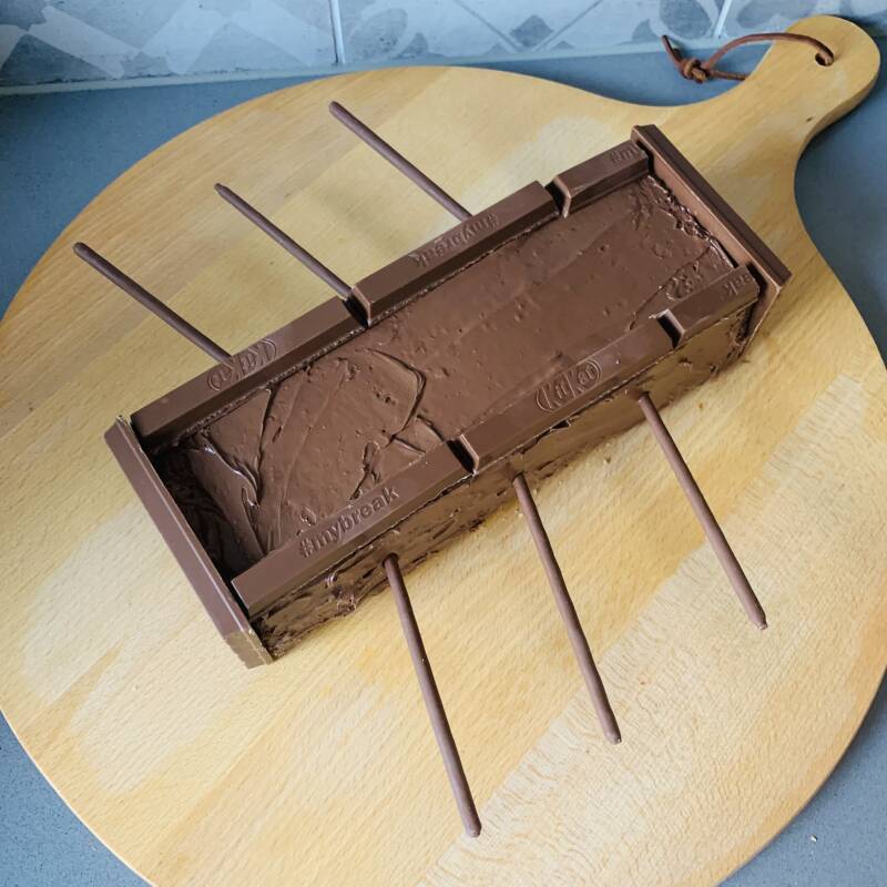 Plak een hele kitkat op de voor en de achterkant en een paar losse reepjes op de bovenkant.