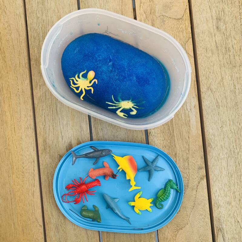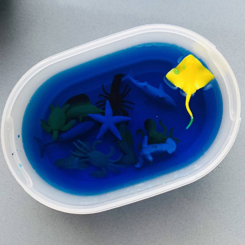 Benodigdheden: water, blauwe voedingskleurstof, plastic zeedieren en een plastic kom.