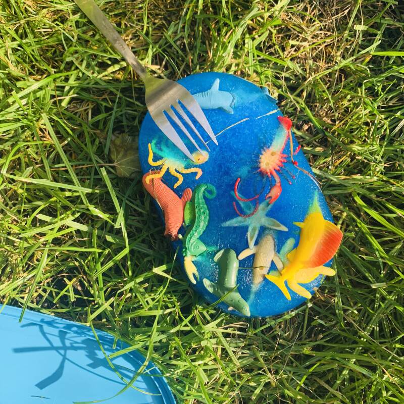Doe wat water in de plastic kom. Voeg een klein beetje blauwe voedingskleurstof toe en roer dit goed door. Doe de plastic zeedieren in het water en zet de bak in de diepvries.