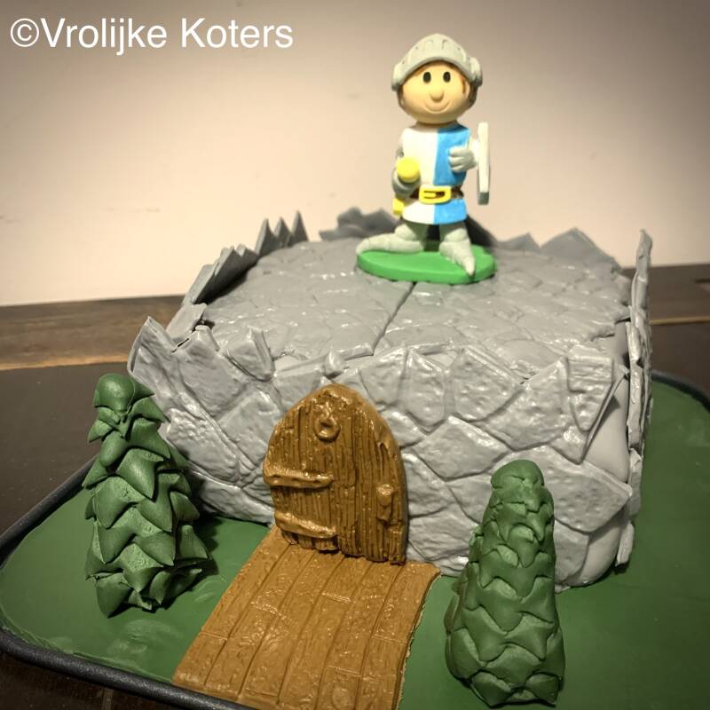 RIDDERTAART: Met wat hout en steen patronen malletjes voor fondant en een ridder van suikergoed maakte ik een riddertaart.