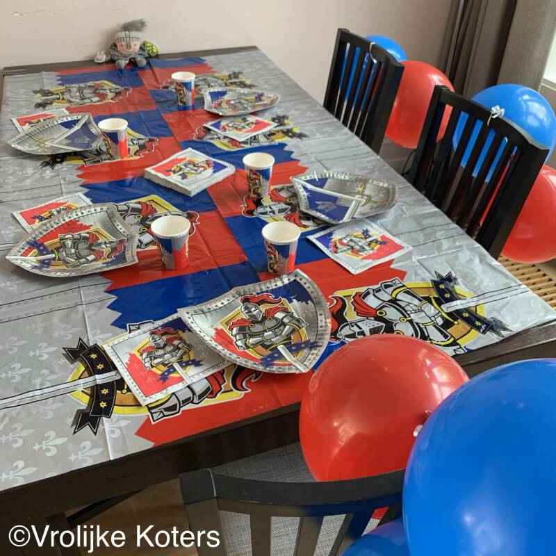 FEESTVERSIERING: Een gezellig kinderfeestje begint natuurlijk met een mooi versierde tafel. En een spannend verhaal! De huiskamer was versierd met: ridder bordjes, bekers, tafelkleed, slingers, servetjes, rode en blauwe ballonnen.