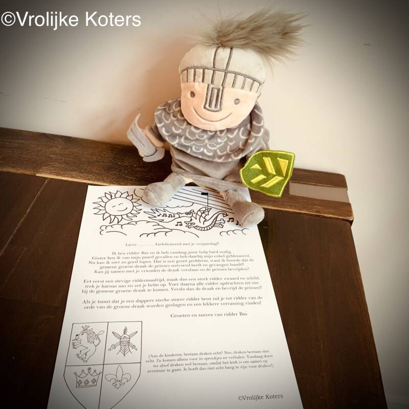 SPANNENDE BRIEF: Op de tafel zat een ridder klaar met een brief speciaal voor de jarige job! "Ik ben ridder Bas en ik heb jouw hulp hard nodig. De draak heeft de prinses gevangen genomen. Kun jij haar redden? Versla de draak en bevrijd de prinses, dan wordt je tot ridder geslagen!