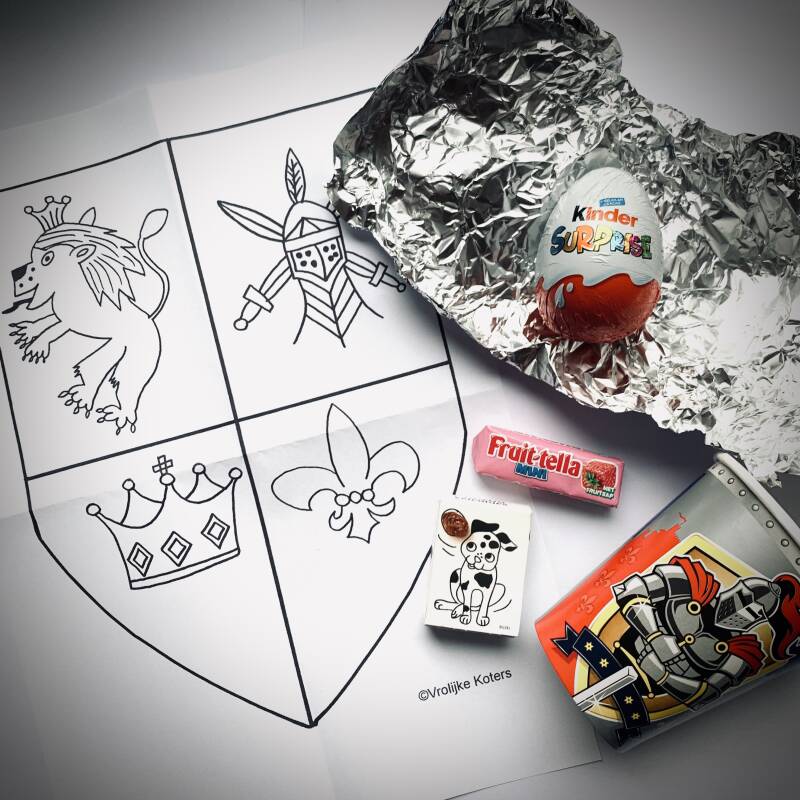 In een ridderbeker zaten: de ridderschild-kleurplaat van Vrolijke Koters, een kindersurprise ei in aluminiumfolie, doosje rozijntjes, een reepje fruitella. Voor de juffen en meesters zat er een doos Celebrations bij.