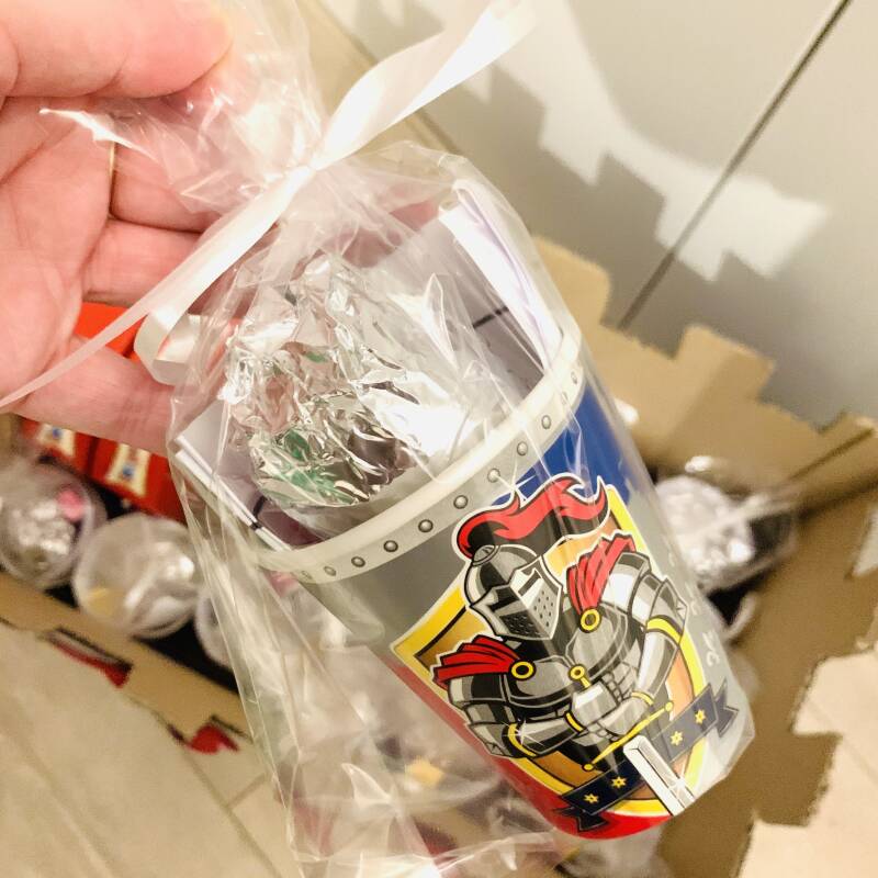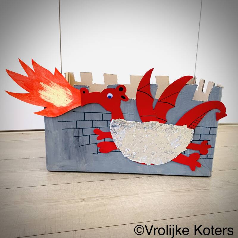 Naar aanleiding van het ridderfeestje trakteerde mijn zoontje op drakeneieren van de zilver-rode draak (kindersurprise eieren in zilverfolie) en drakenpoepjes (doosjes rozijntjes) op school in echte ridderbekers. Coronaproef want alles was voorverpakt. Ik maakte van een doos een kasteel en plakte er een geknutselde draak op (Draakje maken). Daarna zette ik de handpop van de ridder (van de Hema) erin en deed de brief erbij.