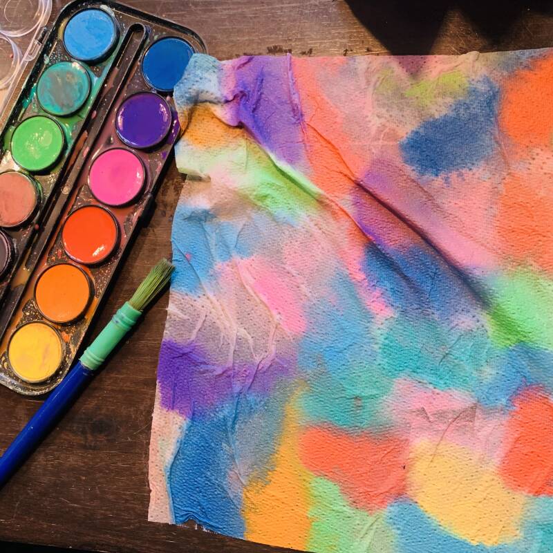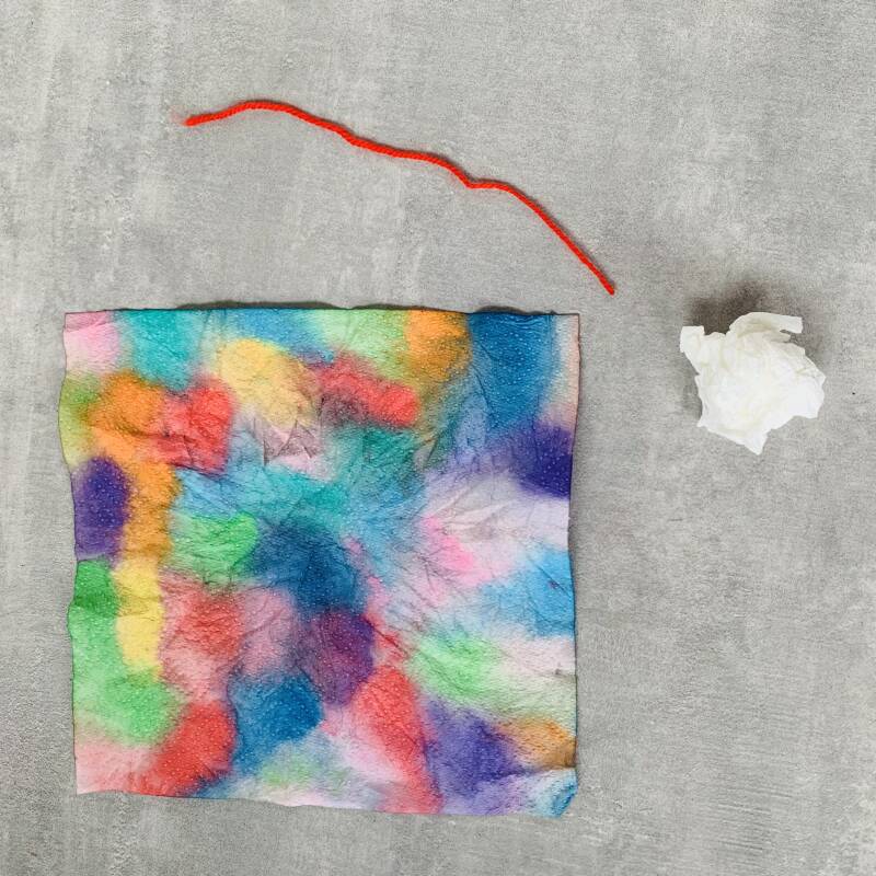 Benodigdheden: een stuk keukenrol of witte stof, waterverf, een zwarte stift en touw.