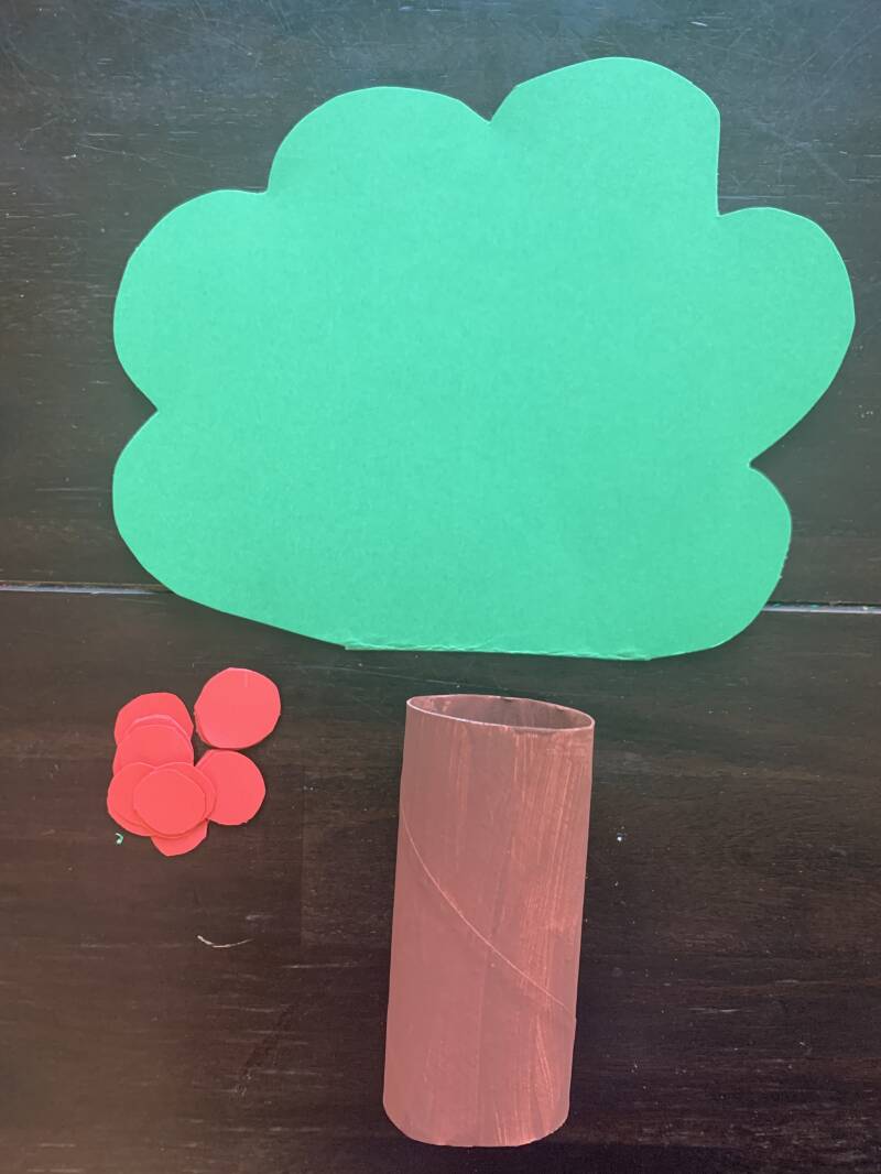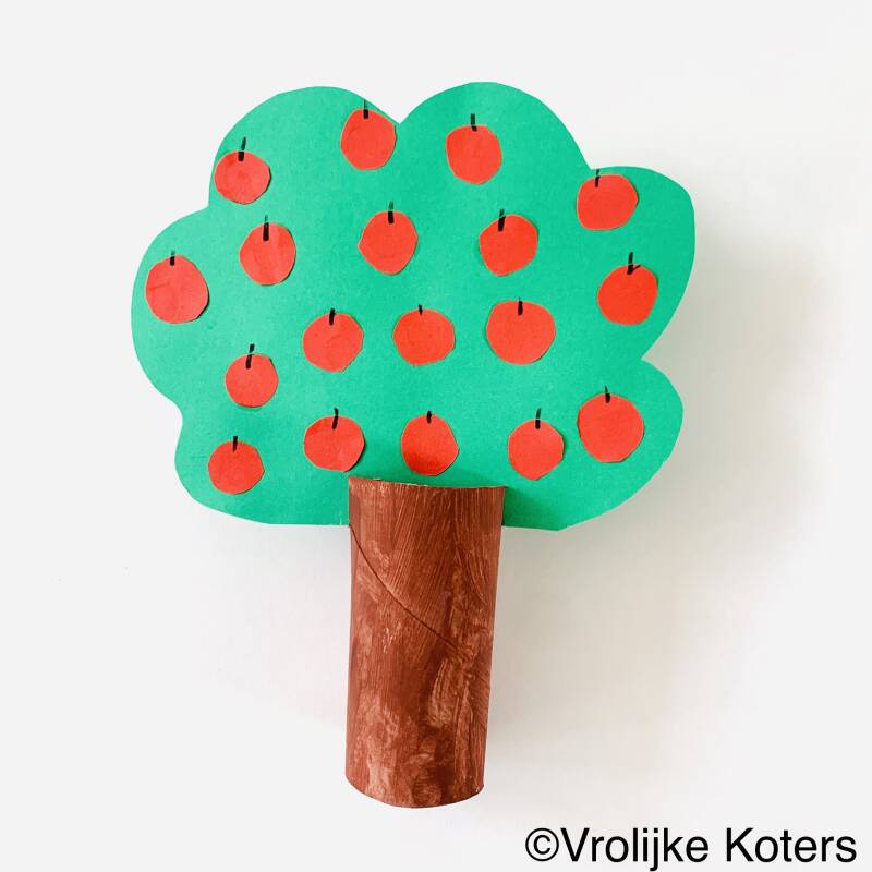 Verf een wc-rolletje bruin en laat het drogen. Knip uit groen karton de bovenkant van de boom. Knip uit rood papier kleine rondjes. Laat je kindje zoveel mogelijk zelf doen hiervan! Eventueel teken je rondjes op het rode papier of helpt met uitknippen.