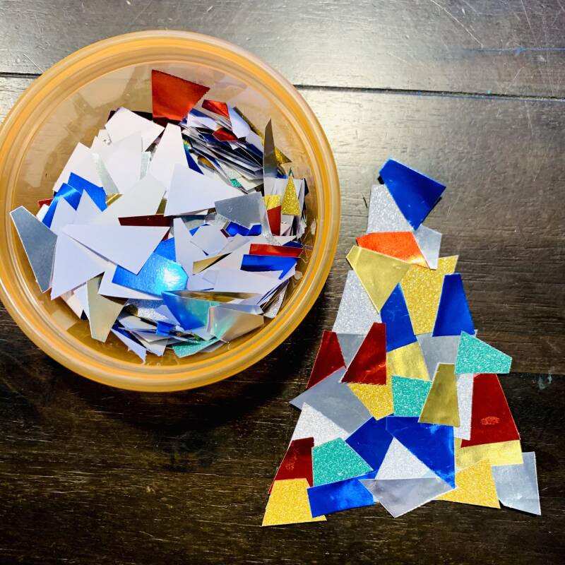 Of beplak de driehoek met stukjes glitter en glimmend papier.