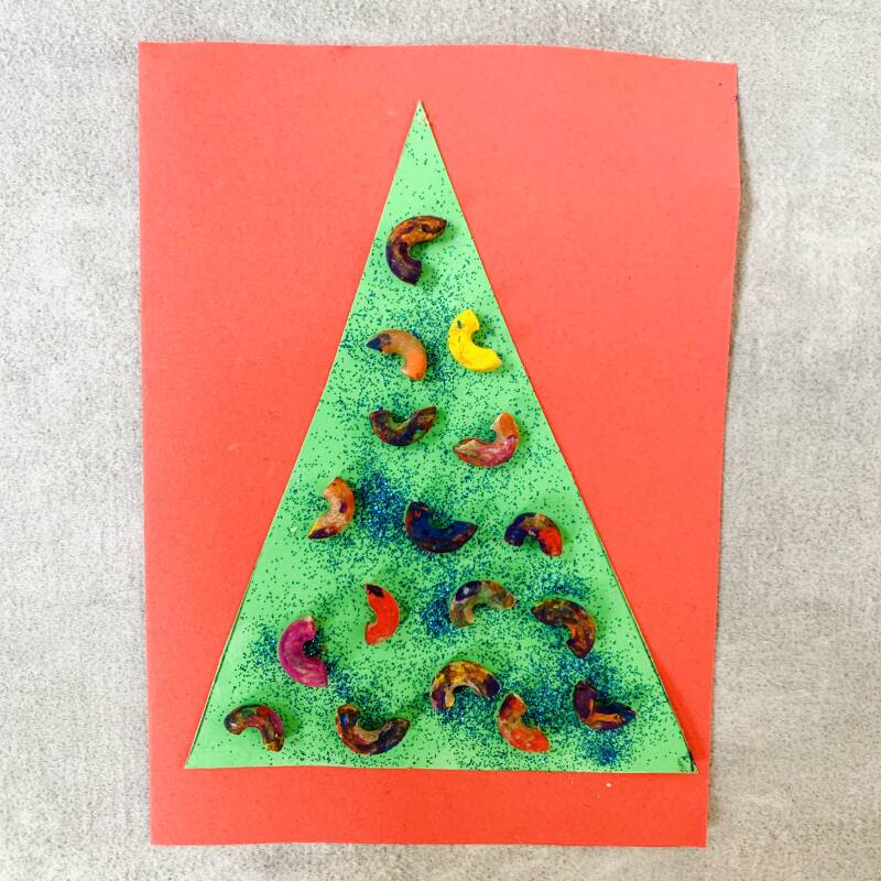 Wat ook nog kan is de kerstboom versieren met geverfde macaroni! Nog wat glittertjes erbij en klaar!