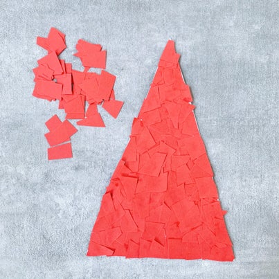 Het lichaam van de kerstman kun je op twee manieren maken: Optie 1 is het beplakken van een wit papieren driehoek met in kleine stukjes geknipt rood papier.