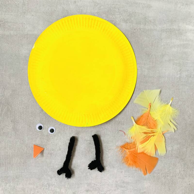 Benodigdheden: gele verf, kartonnen bordje, chenilledraad, lijm, wiebeloogjes, schaar, veertjes, oranje papier voor de snavel.