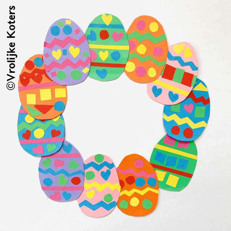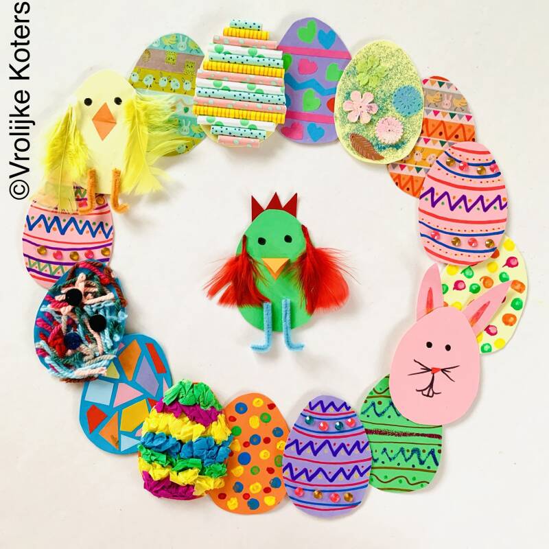 Heb je een heleboel paaseieren gemaakt? Maak dan een krans! Knip dan een ring uit gekleurd karton (of knip het midden stuk uit een kartonnen bordje) en plak de eieren erop.