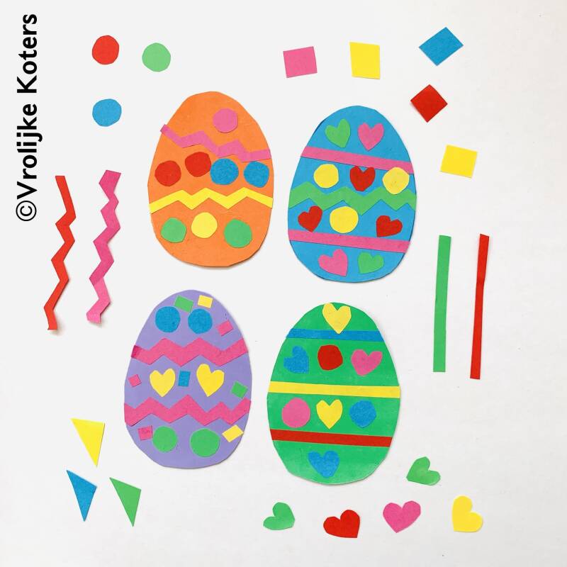 Je kunt ook de paaseieren versieren met hartjes, rondjes, vierkantjes en streepjes van gekleurd papier.