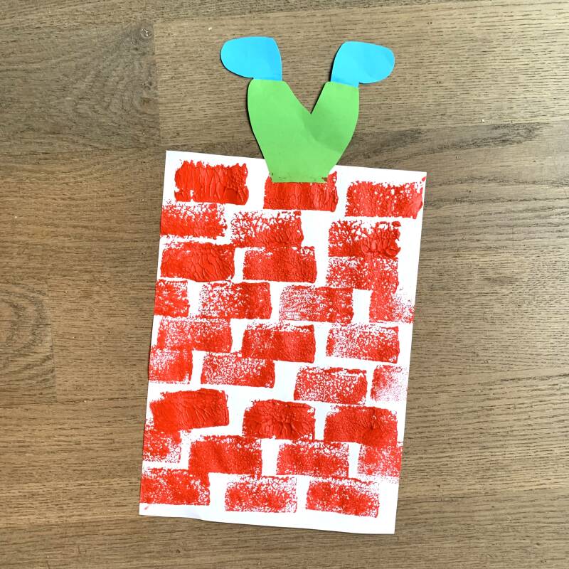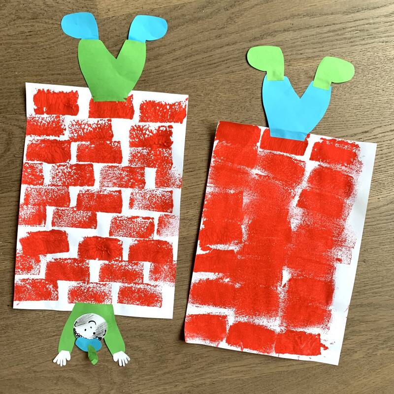Stempel met een schuursponsje en rode verf de schoorsteen. Ooh jeetje Pietje zit vast!
