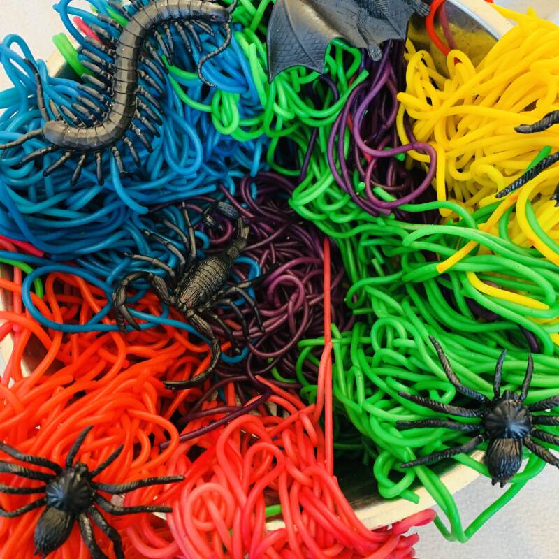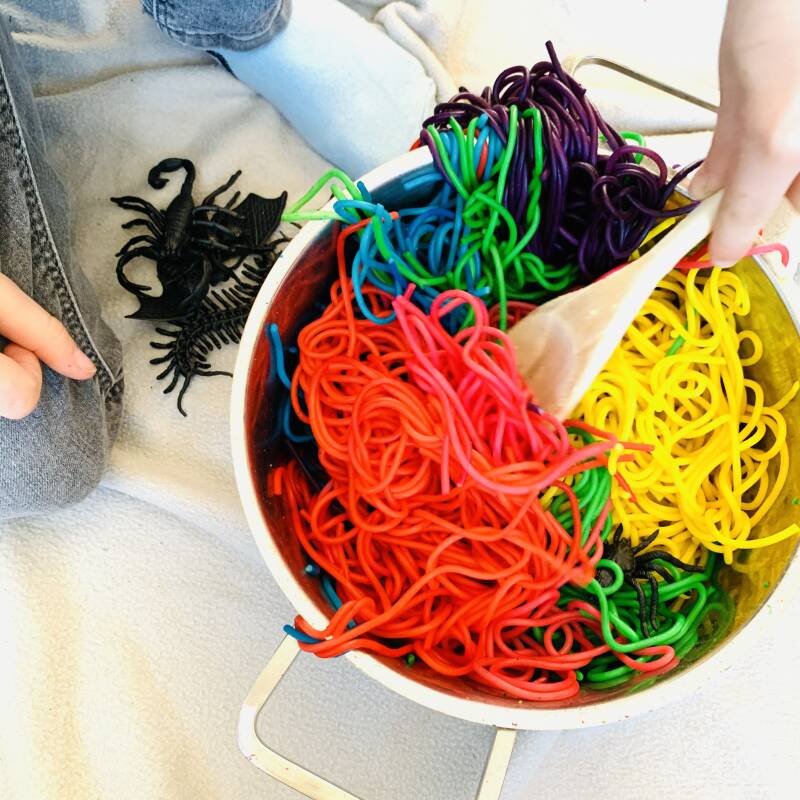Doe de gekleurde sliertjes SPAGHETTI in een pannetje en maak heksensoep ermee! Wat plastic spinnetjes en griezelbeestjes erbij (oa te koop bij een feestwinkel) en een lepel erbij en griezelen maar! Hoe je de spaghetti verft staat hier: Spaghetti Verven.