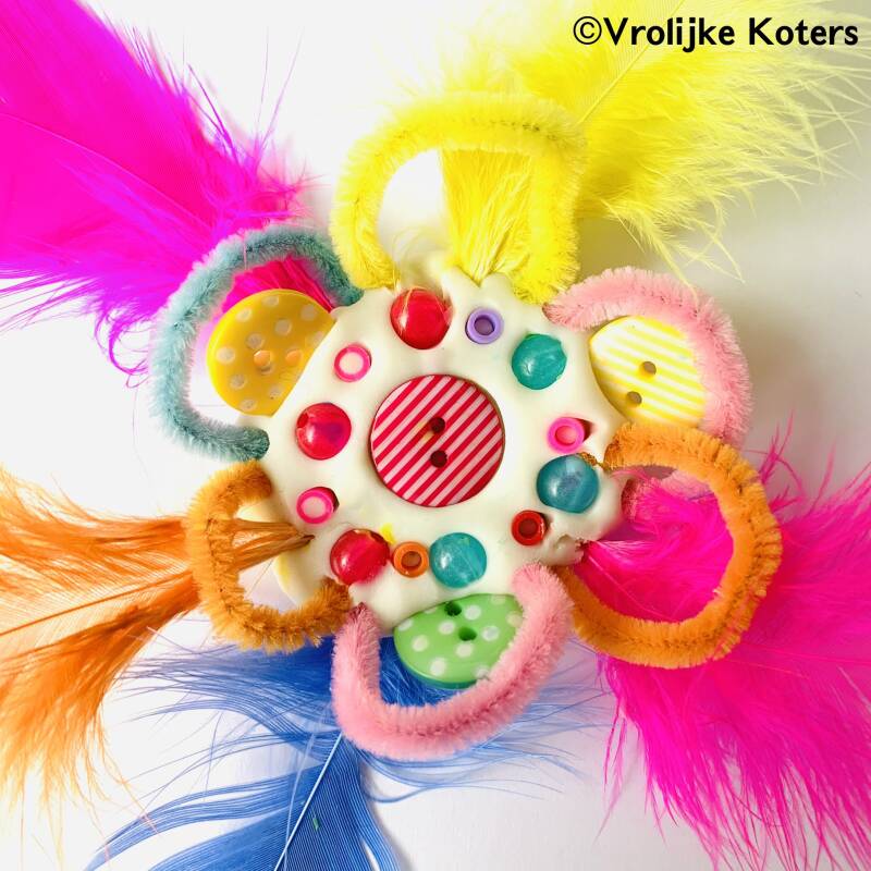 Dit is een platgedrukt rondje van klei met eromheen stukjes chenilledraad als bloemblaadjes en veertjes. Nog wat kraaltjes, strijkkralen en knoopjes erin en klaar is je mooie bloem!