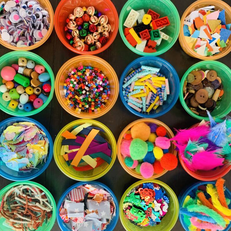 Materialen die geluid geven zijn bijvoorbeeld: strijkkralen, houten kralen, knoopjes, belletjes, stukjes rietjes, legoblokjes etc.