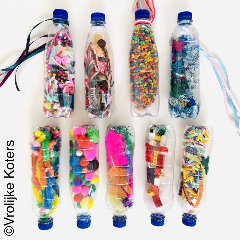 Drink een flesje water leeg en laat het drogen! Zet een heleboel verschillende materialen neer op tafel en laat je kindje lekker zelf kiezen wat er in het schudflesje mag! Sommige materialen geven kleur en andere maken geluid.