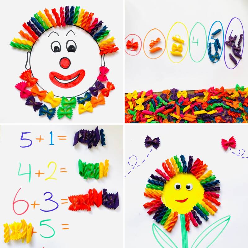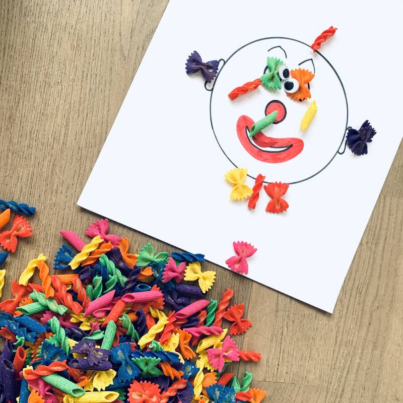 Of combineer de gekleurde pasta met de Werkbladen. Versier de bloem met verschillende soorten pasta of het clowntje. Of leer tellen en rekenen. Hier vind je de Werkbladen. Laat je kindje vooral lekker zijn eigen gang gaan!