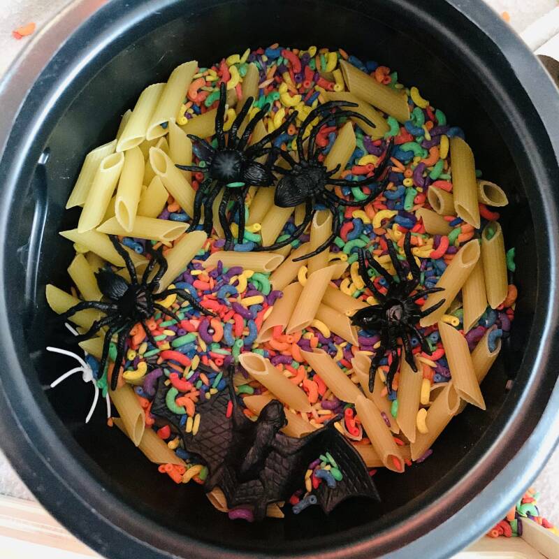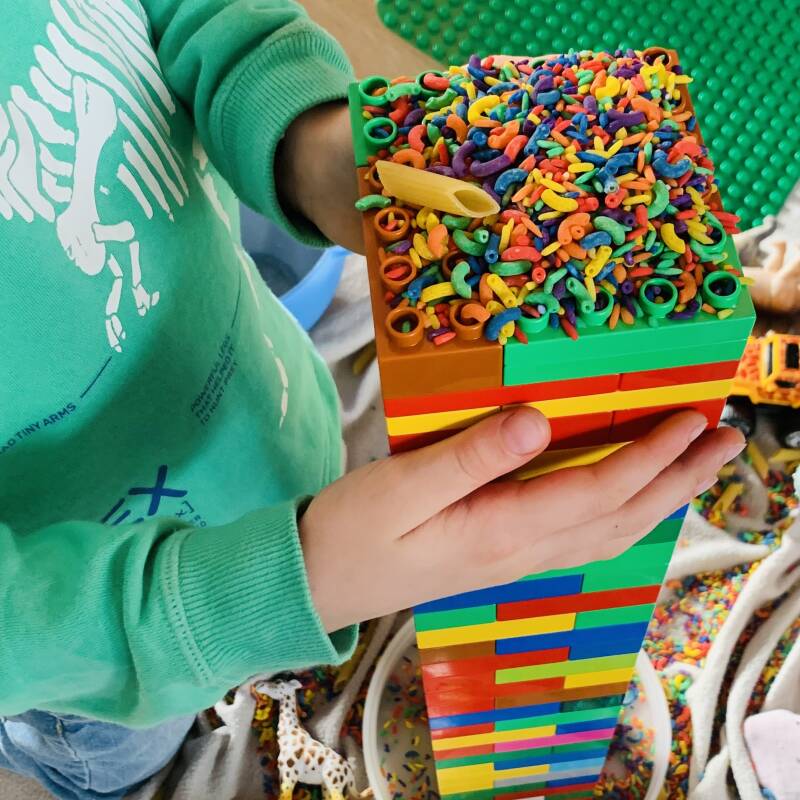 Je kan ook Heksensoep maken met de gekleurde pasta en rijst! Leuk als je het thema bang zijn wil behandelen of tijdens Halloween of gewoon leuk voor tussendoor! Kijk hier: Heksensoep. Of combineer de gekleurde pasta en rijst met het spelen met Duplo. Maak bijvoorbeeld een hele hoge toren en doe er allemaal rijst en pasta in.