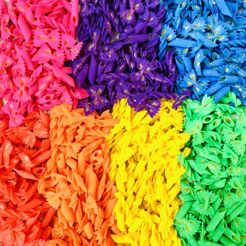 Je kan ervoor kiezen om alle kleuren van de regenboog te maken, maar je kan ook kiezen voor één bepaald thema zoals alleen gele rijst bij de Paas Rijst bijvoorbeeld. Of maak groene rijst en zet dino's erin of boerderijdieren. Of maak een bak met zwarte rijst en leg plastic planeten en sterren erin. Je kan gewone rijst of elleboogjes macaroni verven, maar natuurlijk ook spiraaltjes (fusilli) of buisjes (penne) of vlindertjes (farfalle) pasta. Er is van alles mogelijk! Hieronder staan verschillende speel mogelijkheden uitgewerkt!