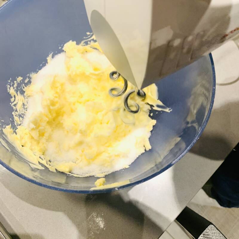 Voeg de suiker toe aan de boter en mix het 5 minuten tot een zachte luchtige structuur ontstaat.