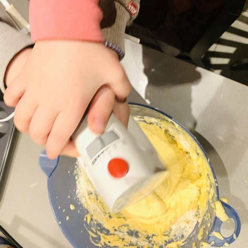 Laat je kindje ook lekker mixen. Let wel op dat de mixer diep in de kom blijft, want anders spat de hele keuken onder met het cakebeslag. Ik spreek uit ervaring ;)
