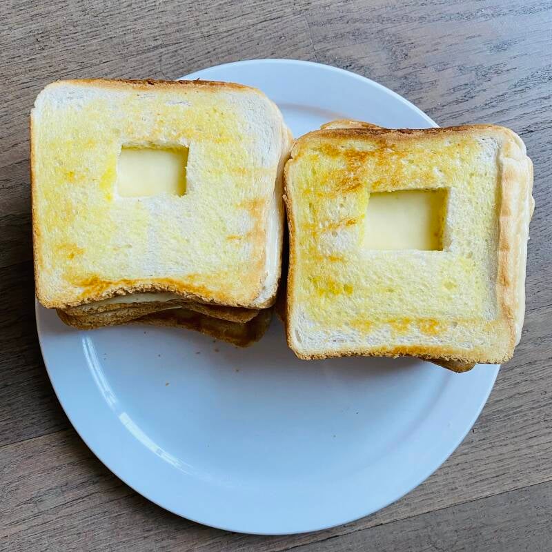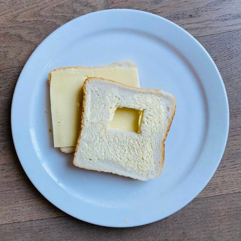 Neem twee witte (of bruine) boterhammen en smeer ze aan de buitenkant in met boter. Leg op de ene boterham een plak kaas. Snijd een ruitje uit de andere boterham en leg alles netjes op elkaar.