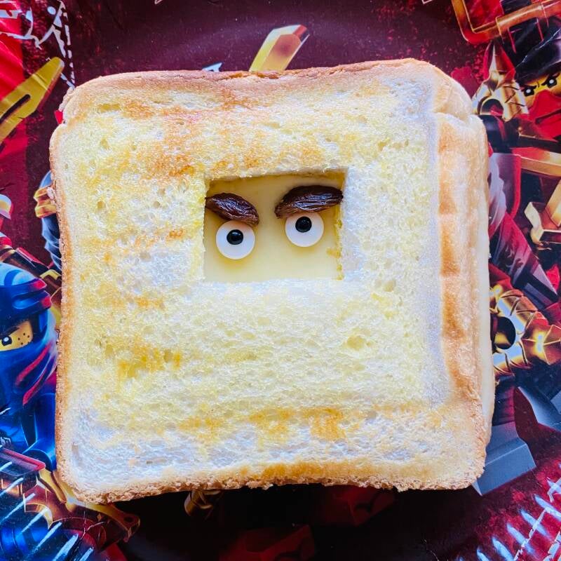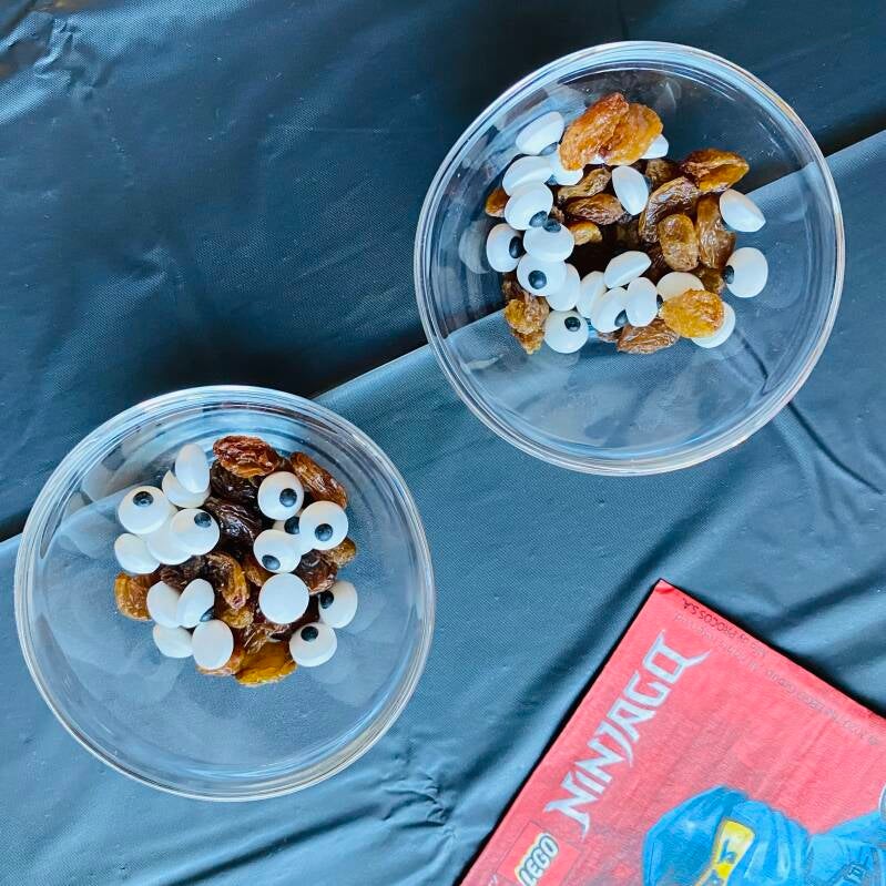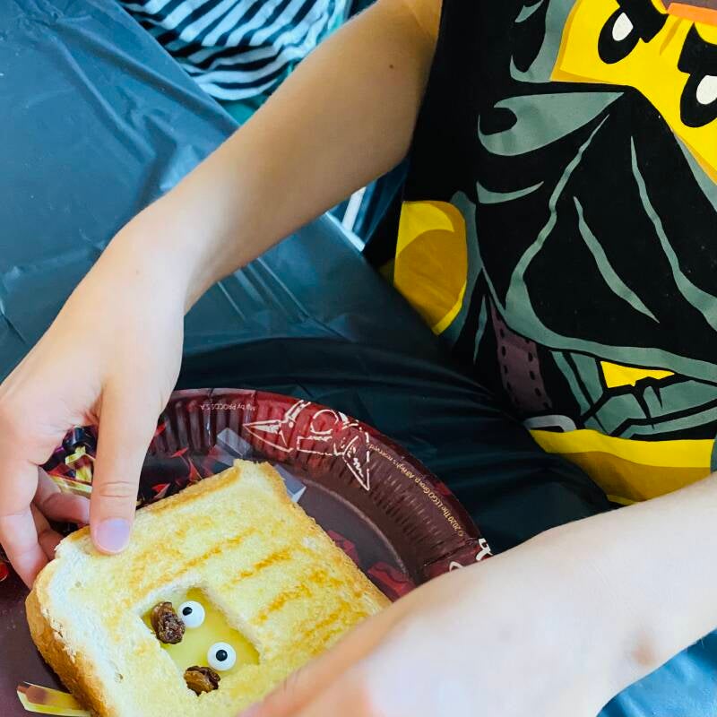 Zet wat suikeroogjes en rozijntjes op tafel en laat de kinderen zelf een Ninjago maken van de tosti.