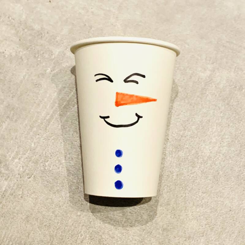 Teken eerst de oogjes met een zwarte stift op de beker. Teken dan de oranje wortelneus. Teken daarna de mond met een zwarte stift en de knopen. De knopen kun je natuurlijk ook een andere kleur geven dan zwart.