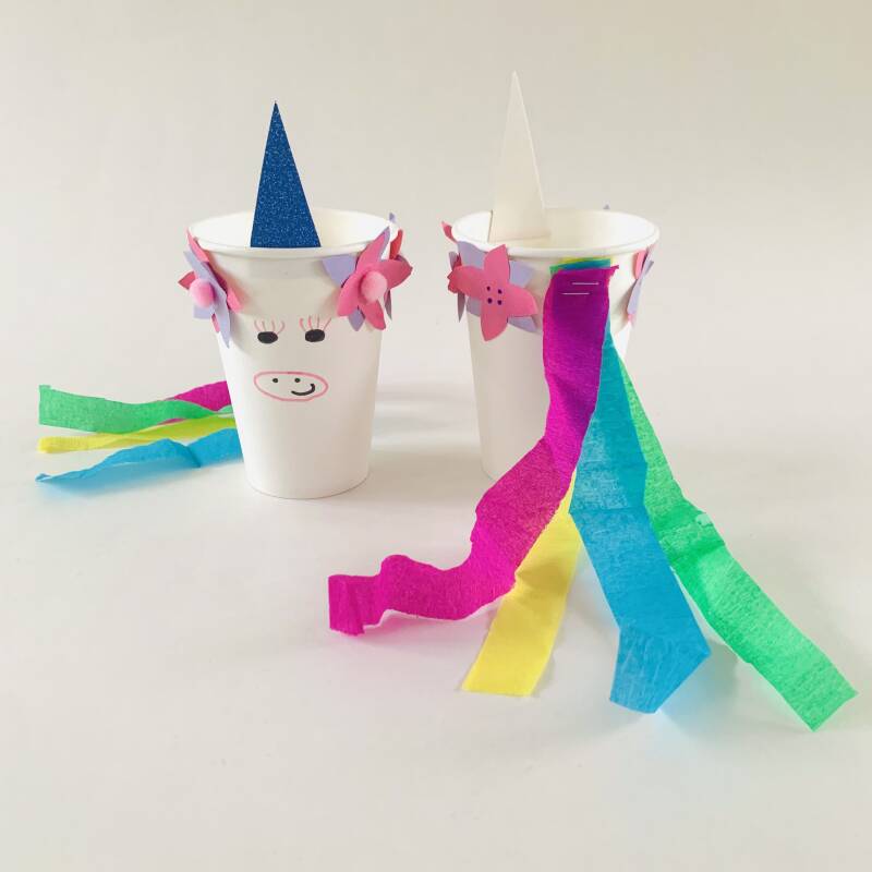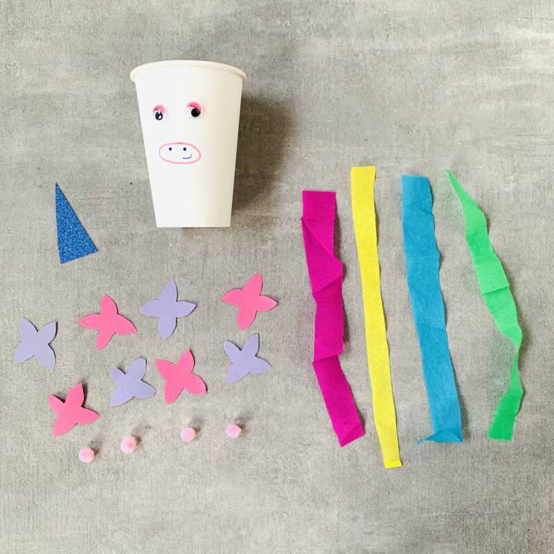 Teken met een roze en een zwarte stift de neus van de eenhoorn. Plak de wiebeloogjes op de beker of teken de oogjes met de zwarte stift. Knip 4 stroken uit het crêpepapier. Knip een hoorn uit gekleurd papier of karton. Knip 8 bloempjes uit gekleurd papier of karton.