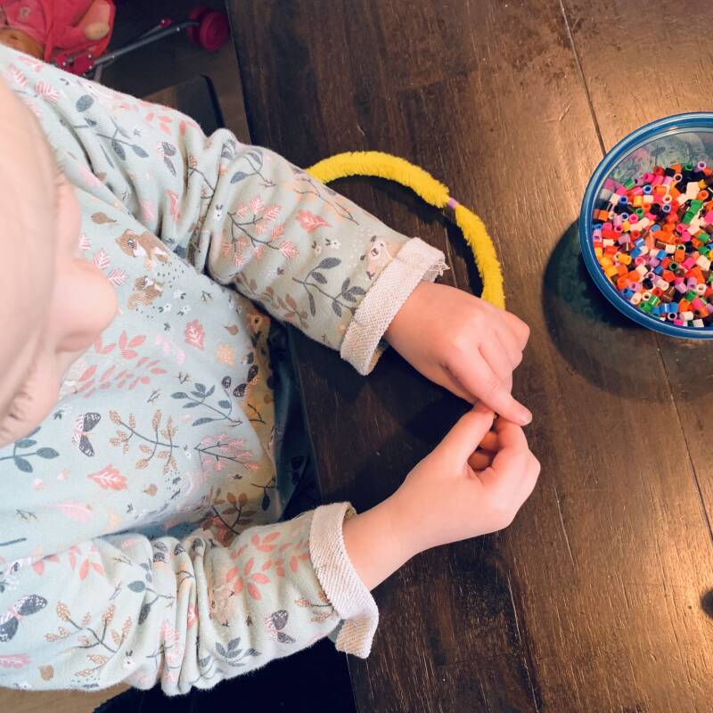 Doe het chenilledraad door de gaatjes. Hou een stukje chenilledraad over wat je terugtrekt en om het andere chenilledraad heenwikkelt. Zo blijft het vast zitten en heb je een vrolijk handvat voor je beker.